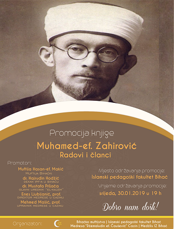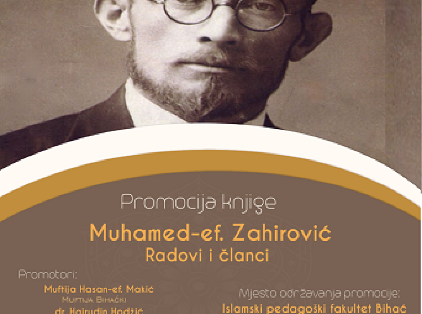 Povodom novoobjavljene knjige Muhamed ef. Zahirovića, bivšeg profesora Državne realne gimnazije u Bihaću i muderrisa Okružne bihaćke medrese, održat će se promocija knjige „Muhamed ef. Zahirović radovi i članci" u amfiteatru Islamskog pedagoškog fakulteta u srijedu 30. januara sa početkom u 19h.