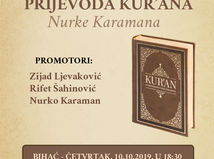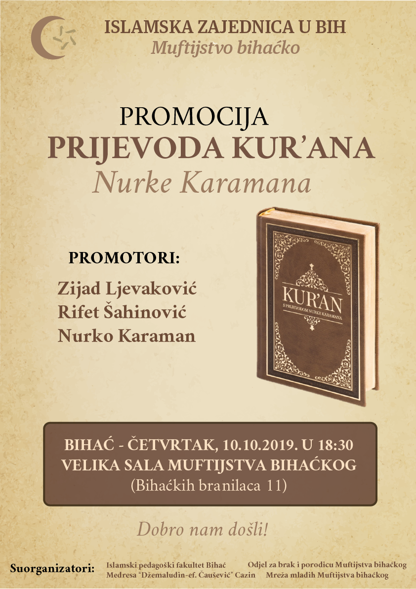 Predstavljanju ovog prijevoda će imati priliku prisustvovati i publika sa prostora Unsko-sanskog kantona i bihaćkog muftijstva. Promocija će biti organizovana u organizaciji Muftijstva bihaćkog i pod pokroviteljstvom muftije bihaćkog hafiza Mehmed-ef. Kudića. Ovaj događaj vrijedan svake pažnje će biti upriličen u četvrtak, 10.10.2019. godine sa početkom u 18:30 minuta u velikoj Sali bihaćkog muftijstva. Promotori ovog vrijednog dijela su prof. Zijad Ljevaković, dr. Rifet Šahinović i prevodilac prof. Nurko Karaman. Promocija se organizuje uz podršku suorganizatora Islamskog pedagoškog fakulteta, medrese "Džemaludin-ef. Čaušević", Mreže mladih i odjela za brak i porodicu Muftijstva bihaćkog.