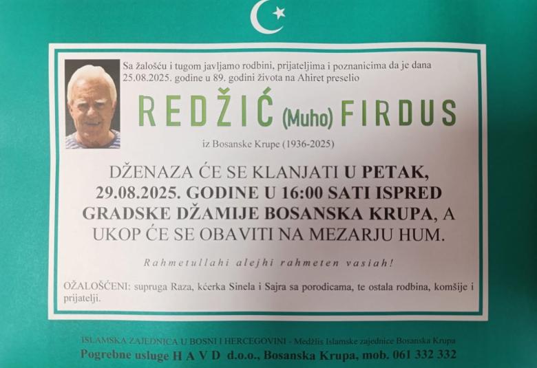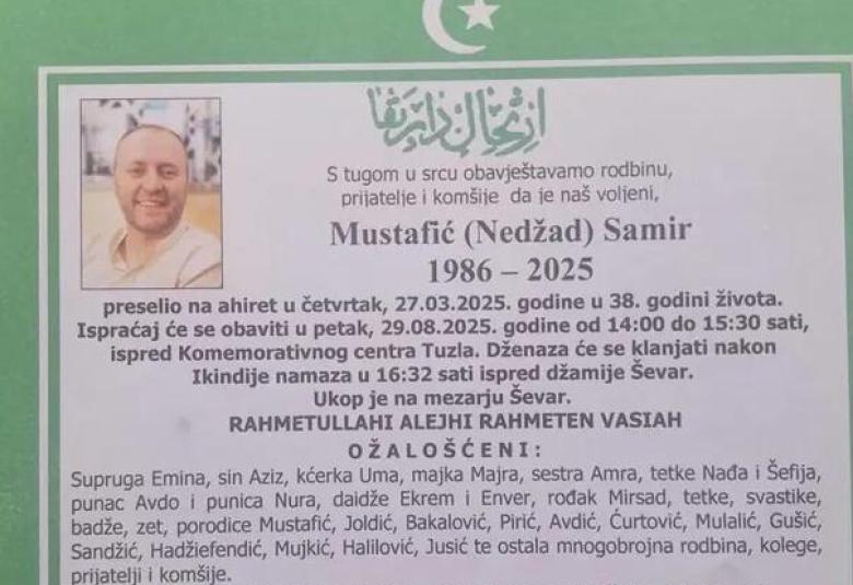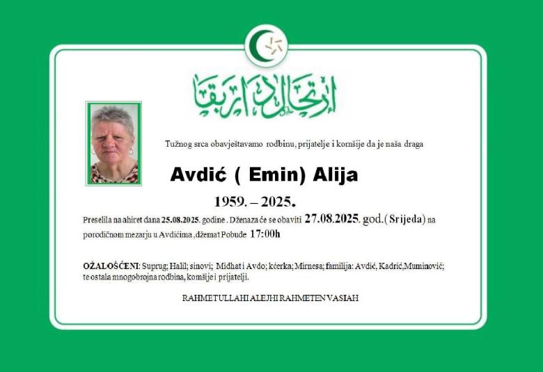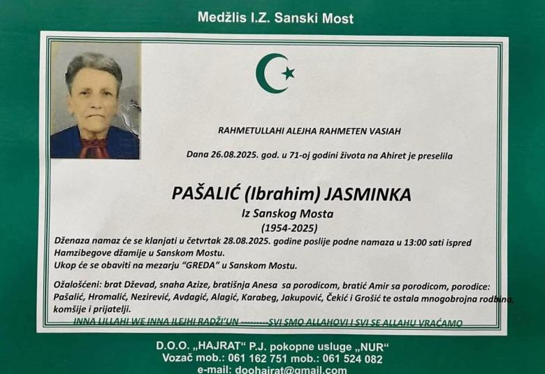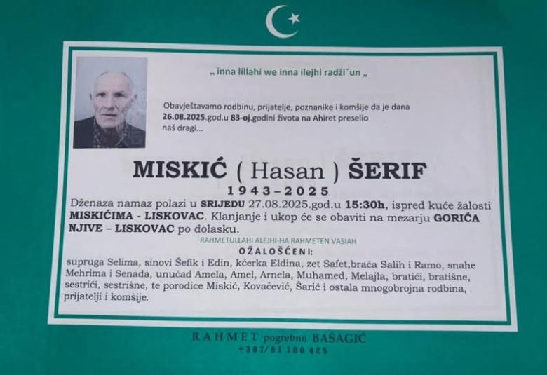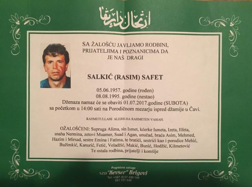 Dženaza Salkiću će biti obavljena 1.7.2017. godine (subota) na porodičnom mezarju ispred džamije u Čavi, u 14:00 h.