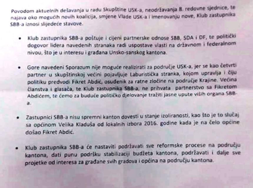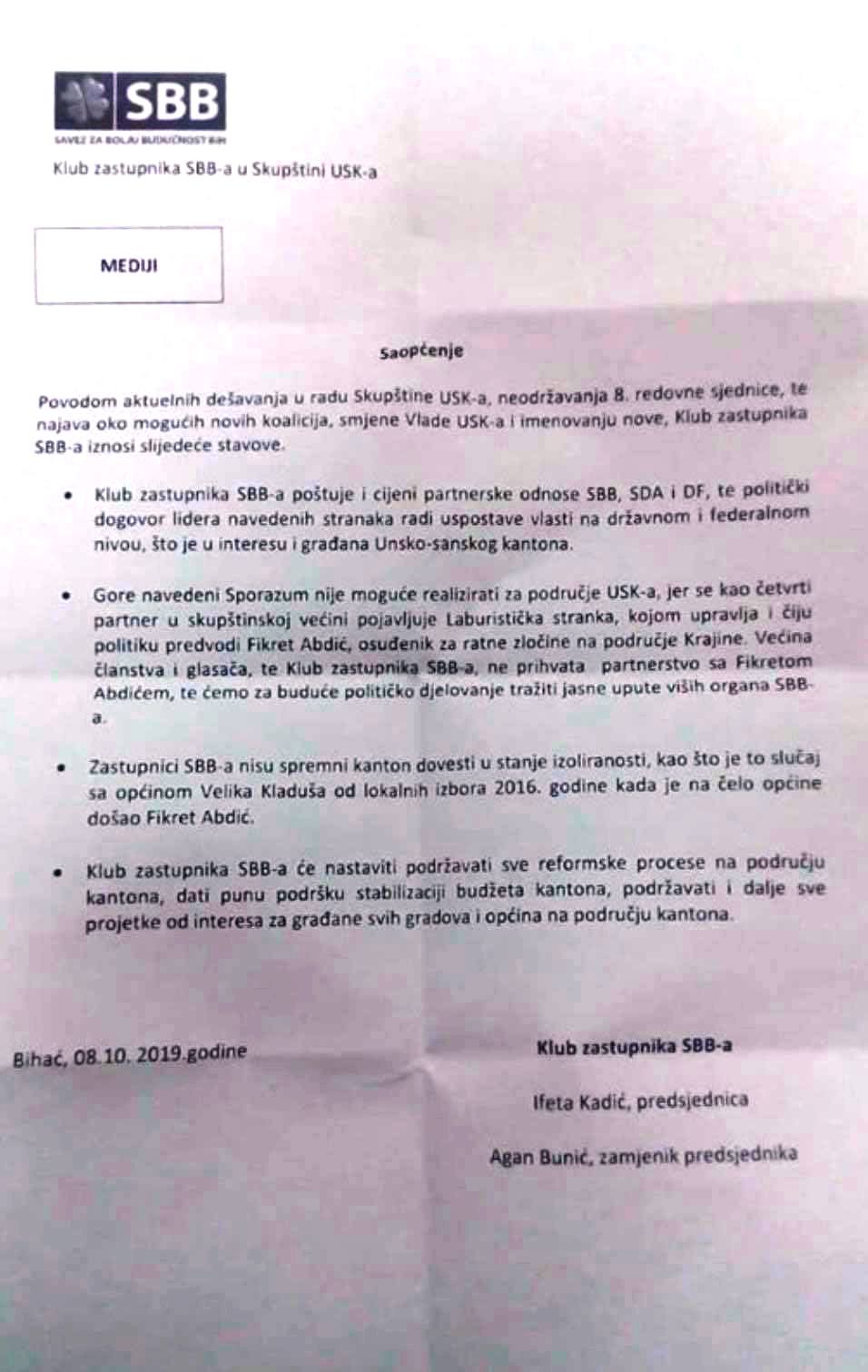 U prilogu je tekst saopćenja zastupnika SBB-a u Skupštini USK Agana Bunića i Ifete Kadić.