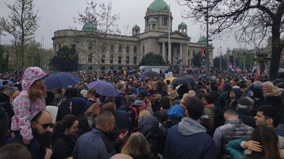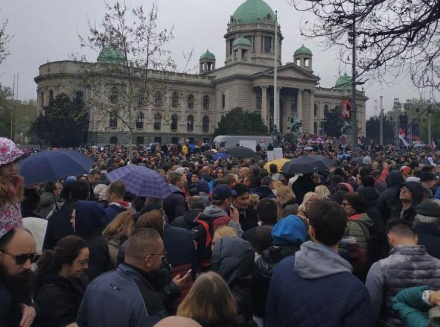Pred Domom Narodne skupštine još traje okupljanje učesnika protesta. Oni nose zastave Srbije i transparente na kojima, uz obavezno "Jedan od pet miliona", piše i ime grada iz kojeg su došli.