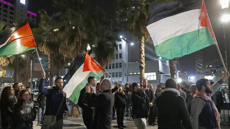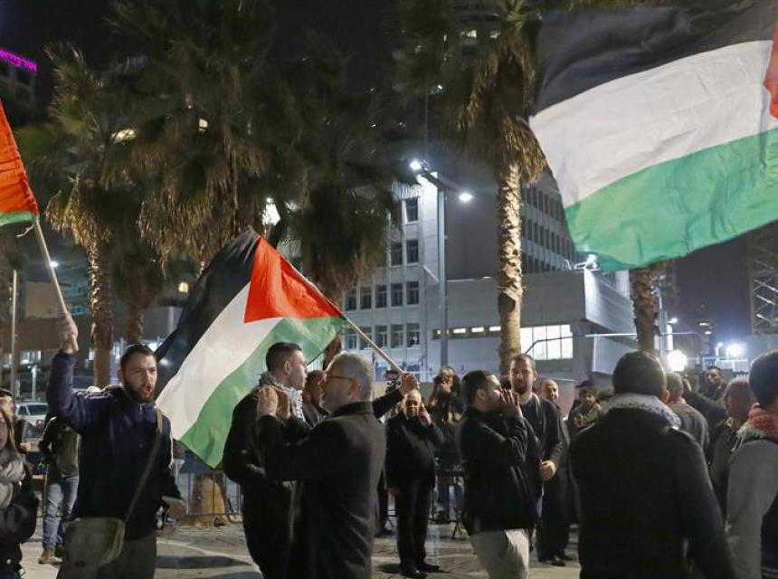 Grupa Palestinaca i Arapa je u utorak ispred zgrade američke ambasade u Tel Avivu održala proteste protiv odluke američke administracije o priznavanju Jerusalema kao glavnog grada Izraela.