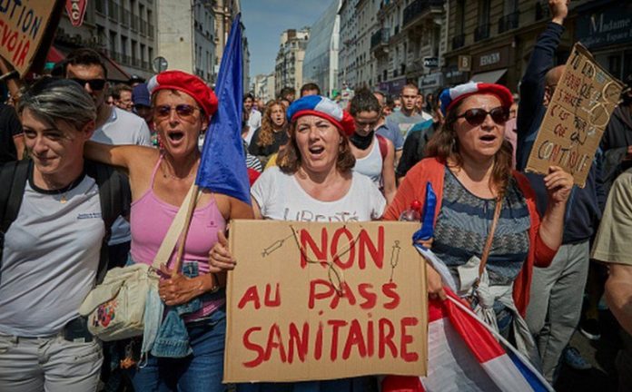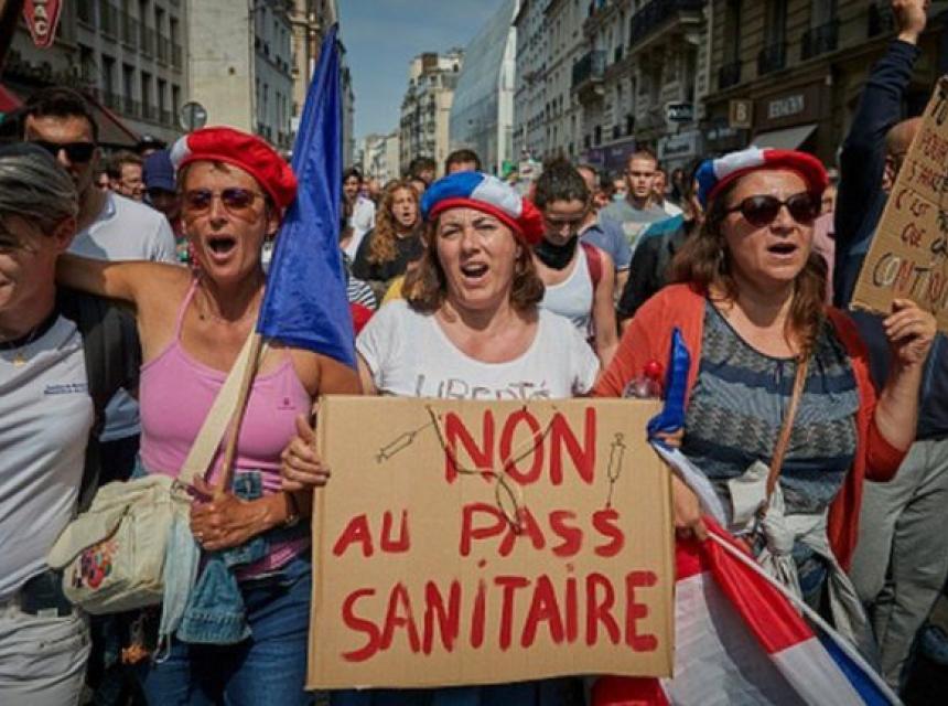 Tokom vikenda više od 100.000 ljudi izašlo je na ulice širom Francuske kako bi osudili nove mjere. Među kontroverznim mjerama su i obavezna vakcinacija radnika zdravstvenih službi i propusnice za ulazak u većinu javnih mjesta.