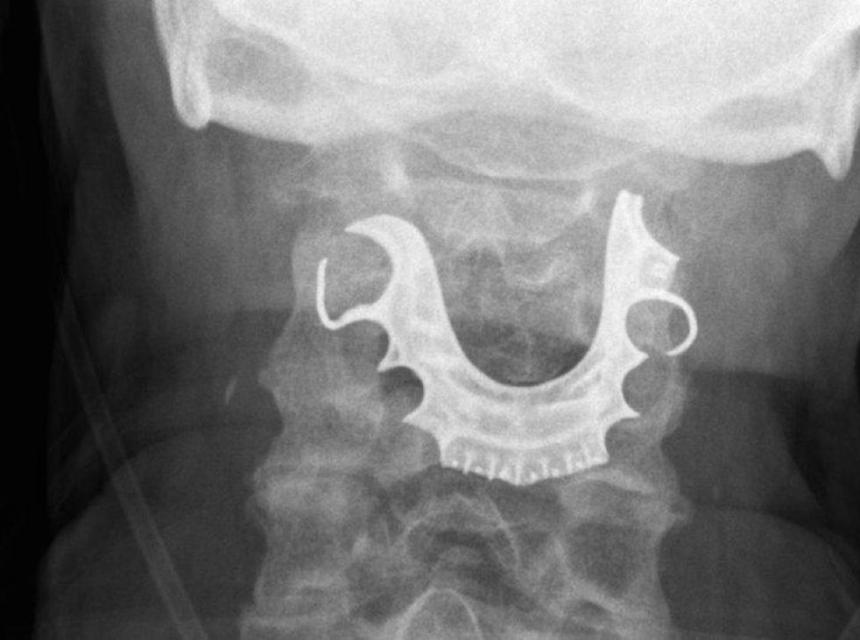 Kada se muškarac dva dana kasnije ponovo javio kod lekara, medicinsko osoblje pregledalo je grlo i glasne žice - i pronašlo polukružni predmet koji leži preko njih.