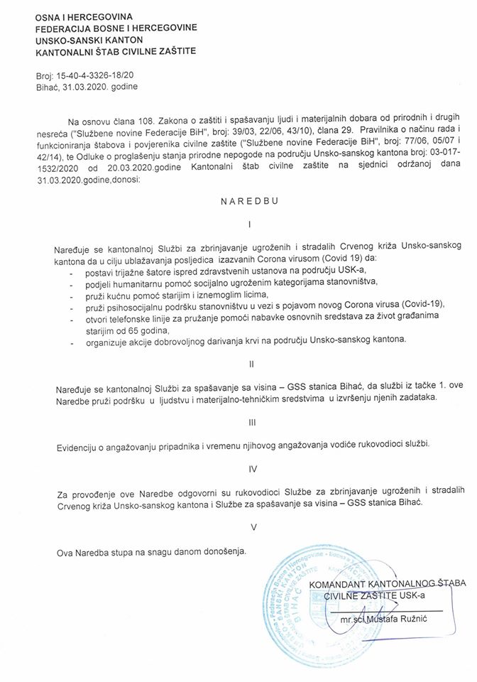 Kantonalni štab civilne zaštite na sjednici održanoj dana 31.03.2020.godine, donosi sljedeće naredbe: