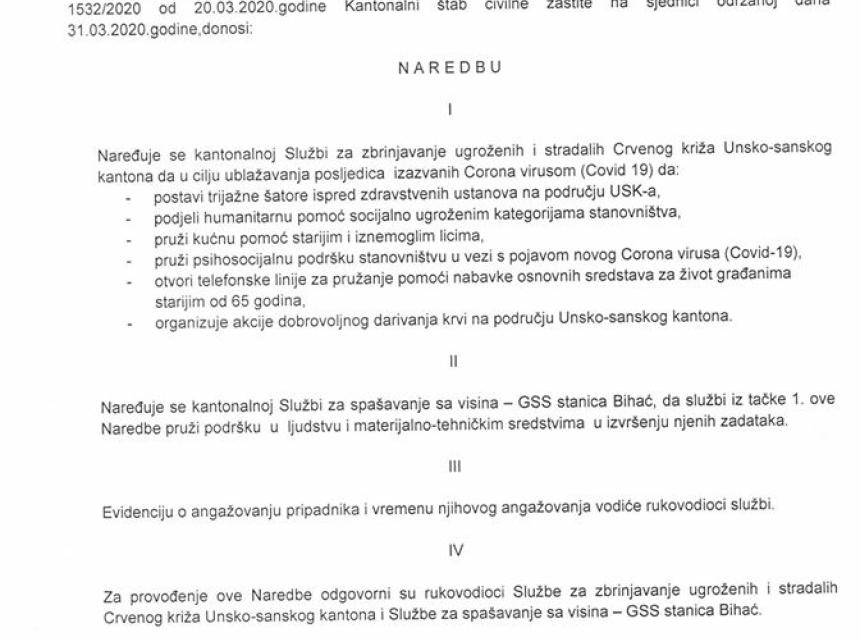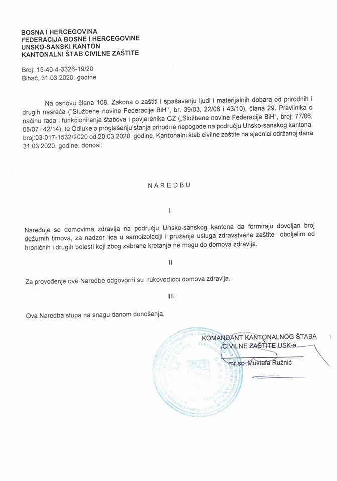 Naređuje se domovima zdravlja na području Unsko-sanskog kantona da formiraju dovoljan broj dežurnih timova, za nadzor lica u samoizolaciji i pružanja usluga zdravstvene zaštite oboljelim od hroničnih i drugih bolesti koji zbog zabrane kretanja ne mogu do domova zdravlja. Ostale naredbe možete pronaći u FOTO GALERIJI članka.