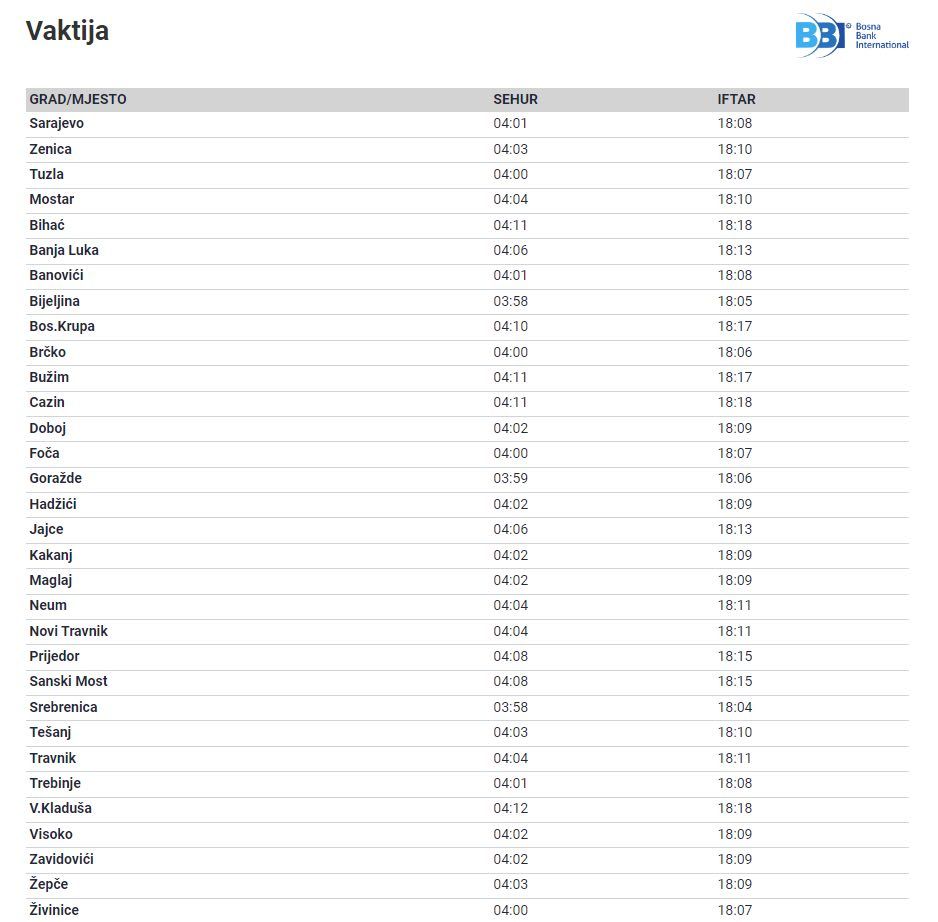 Iftar u Sarajevu nastupa u 18:08 sati, kao i u Banovićima, Trebinju. Minut kasnije iftar nastupa u Doboju, Kaknju, Maglaju, Visokom, Zavidovićima, i u Žepču.