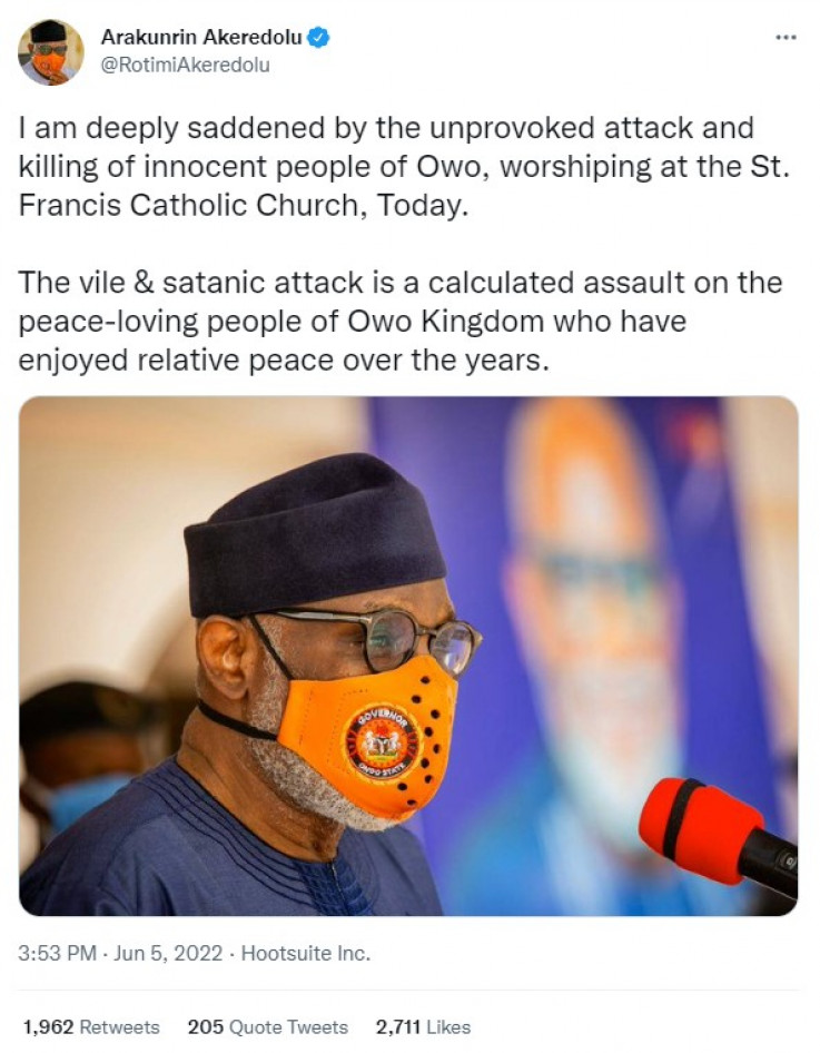 Kako se navodi, napadači su koristili vatreno oružje i navodno eksploziv. Anakunrin Akeredolu, guverner nigerijske države Ondo, osudio je podli i satanistički napad na crkvu Svetog Franje, obećavajući da će uhvatiti napadače.