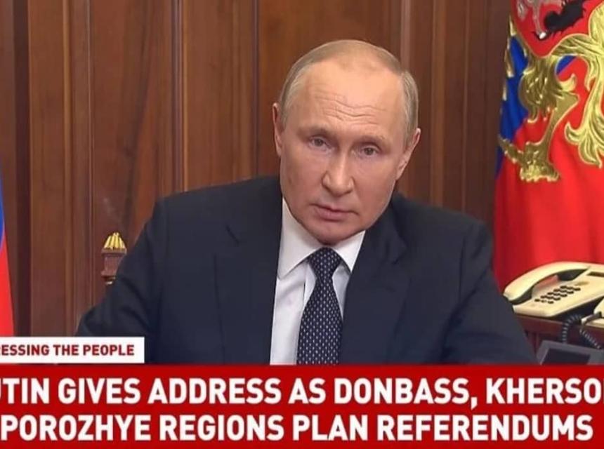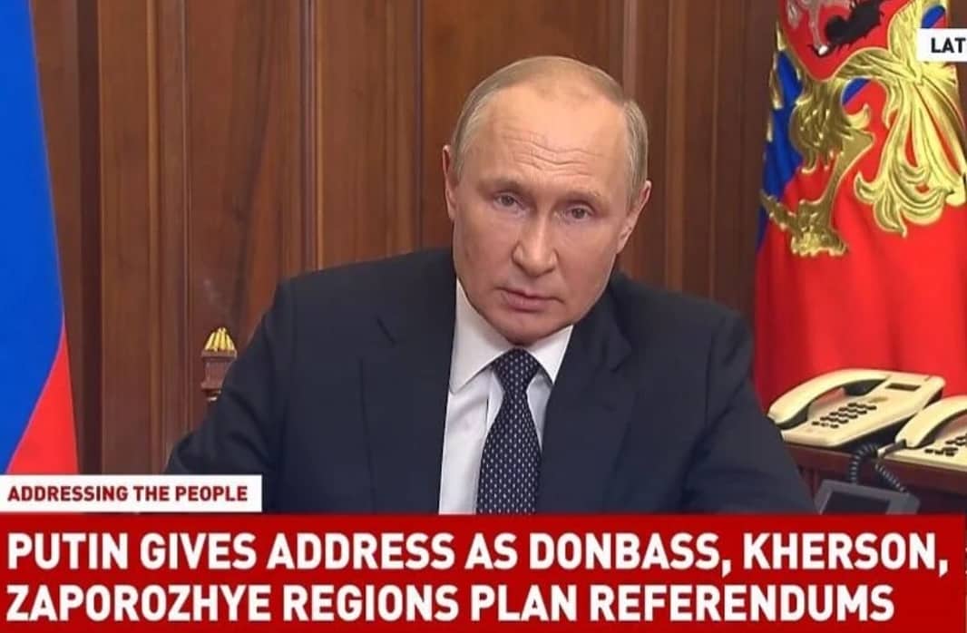 "Naša braćo i sestre u Donbasu, Hersonu i Zaporožju. Učinit ćemo sve kako bi se referendumi održali i kako bi ljudi izrazili svoju volju. Odluku će donijeti građani Luganska, Donjecka, Zaporožja i Hersona. Moramo učiniti sve kako bi zaštitili našu domovinu, ljude u Rusiji i ljude na 'oslobođenim' teritorijima. ", mišljenja je Putin.