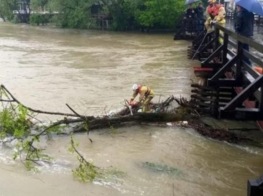 Gradske službe su angažirane da očiste nanose granja nakupljenog na šipu drvenog mosta na Uni, kako bi se spriječilo eventualno oštećenje.