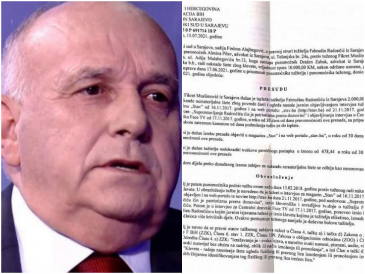 Općinski sud u Sarajevu donio je presudu u predmetu broj: 65 0 P 691714 18 5 kojom je prihvatio tužbu Fahrudina Radončića protiv Fikreta Muslimovića zbog kleveta koje je o njemu iznosio u turskom magazinu "Stav" i u Centralnom Dnevniku Face TV-a u 2017. godini.