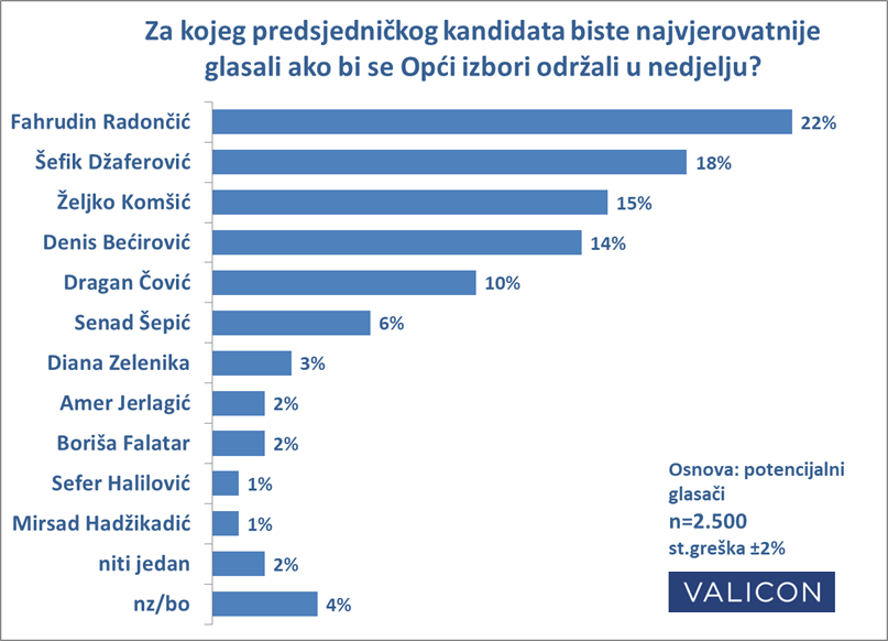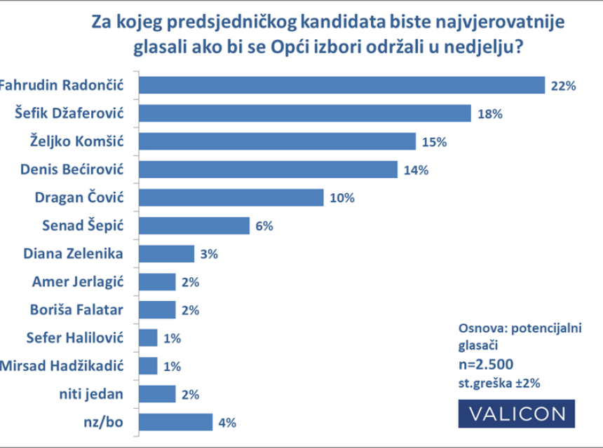 Ispitivanje javnog mnjenja o popularnosti stranaka i kandidata za Predsjedništvo BiH koje je provela nezavisna međunarodna agencija Valicon u periodu 04.06. – 07.07.2018. na uzorku od 2.500 ispitanika u cijeloj Federaciji BiH, pokazuje ubjedljivo prvo mjesto Fahrudina Radončića i vodeću poziciju Saveza za bolju budućnost (SBB).