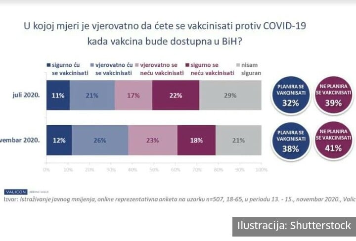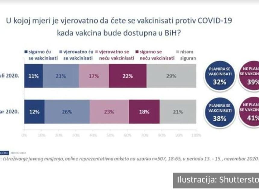 Za vakcinaciju je 38% bh. populacije, a protiv 41%, dok je ostatak populacije neodlučan i nema jasan stav kada je u pitanju namjera eventualne vakcinacije protiv COVID-19.