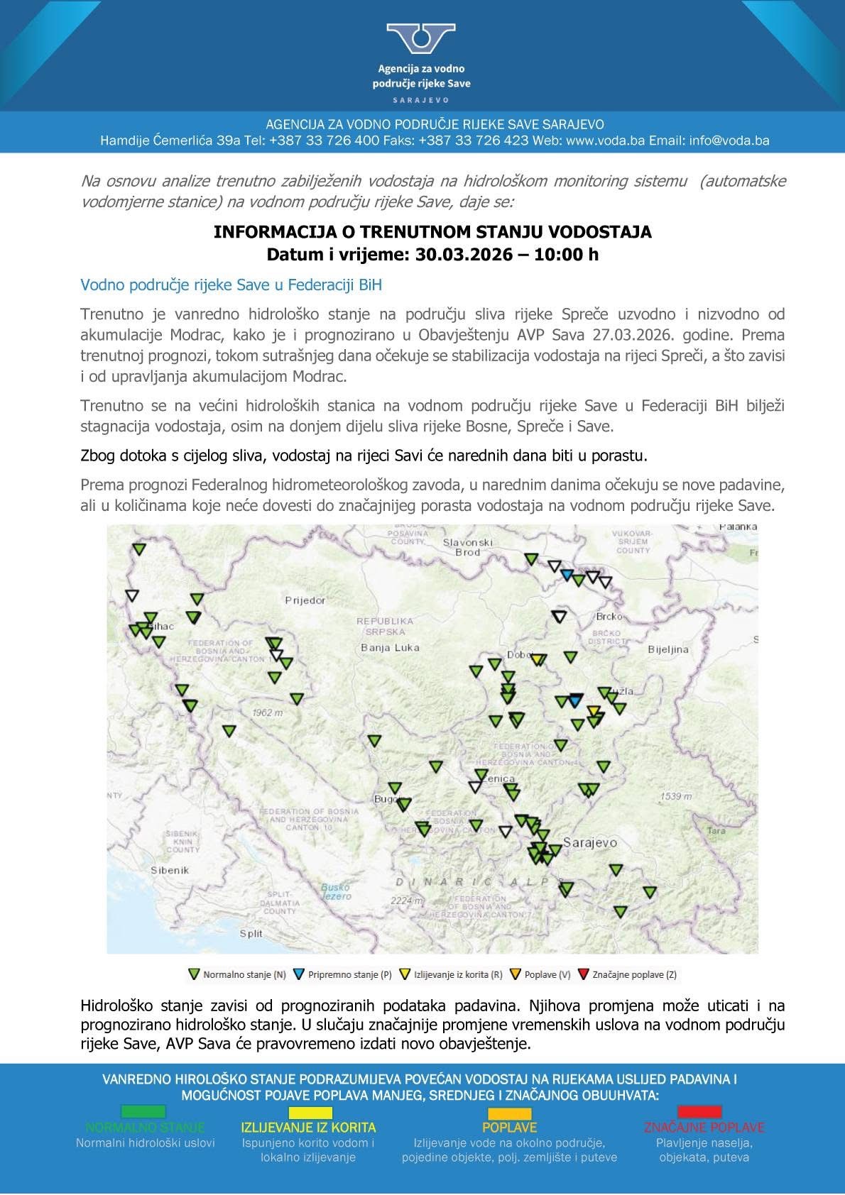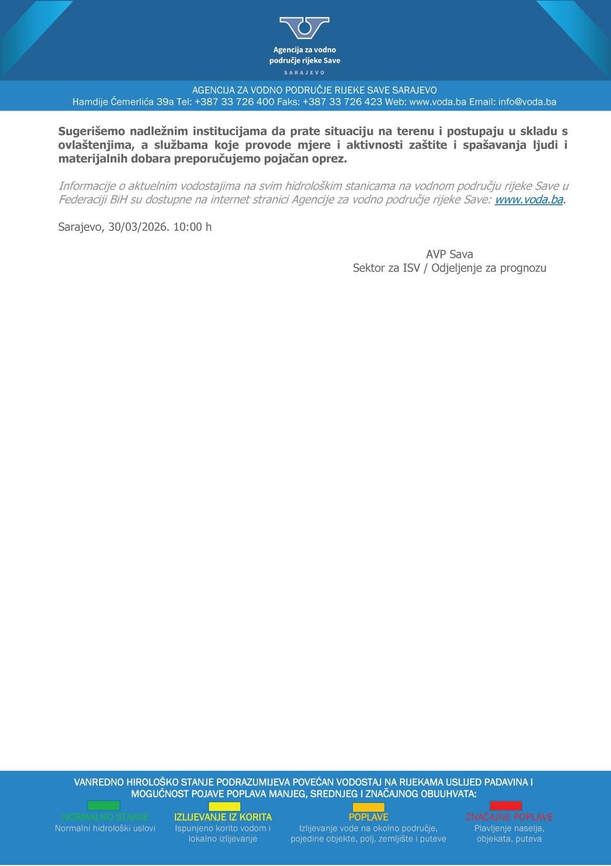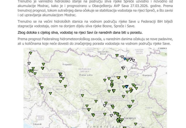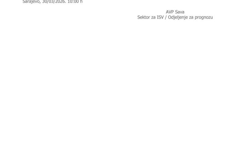 Agencija za vodno područje rijeke Save iz Sarajeva objavila je najnovije informacije o stanju vodostaja na području Federacije Bosne i Hercegovine, zaključno sa 30. martom 2026. godine u 10 sati.