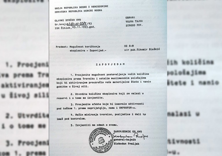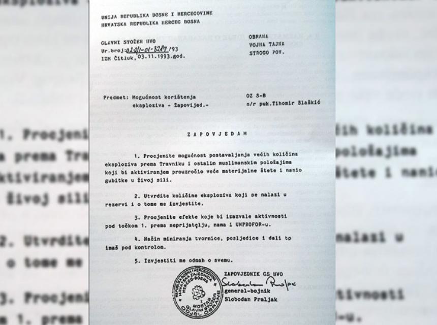 Trećeg novembra 1993. godine Slobodan Praljak, ispred Glavnog stožera HVO-a izdao je zapovijed pod nazovom „Mogućnost korištenja eksploziva“, tražeći odgovor Blaškića. Radi se o fabrici eksploziva „Vitezit“ u Vitezu. Praljak piše: