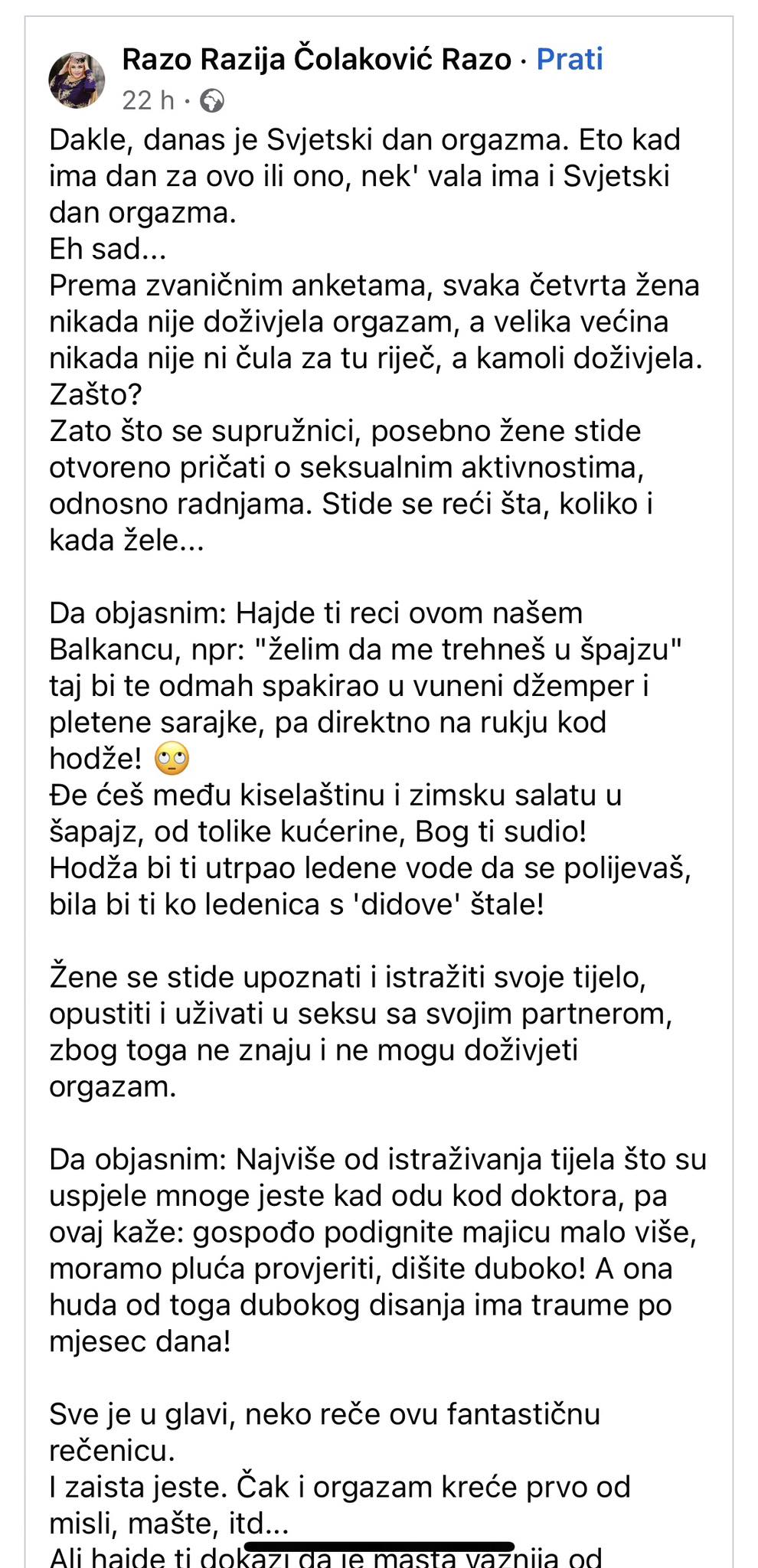 P.S. Neka vam je sretan Svjetski dan orgazma. Dame moje, savjetujem proslavite večeras sa svojim muževima”- zaključila je Razija Čolaković.