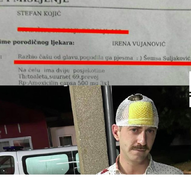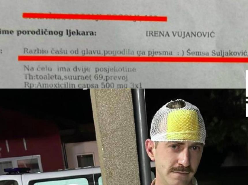 “Razbio čašu od glavu, pogodila ga pjesma od Šemse Suljaković – pristajem na sve. Na čelu ima dvije posjekotinje kao i otvorenu ranu na glavi. Kontrola i previjanje kod nadležnog ljekar” – navodi se u nalazi i mišljenju porodičnog ljekara Doma zdravlja u Gradiškoj Irene Vujanović.