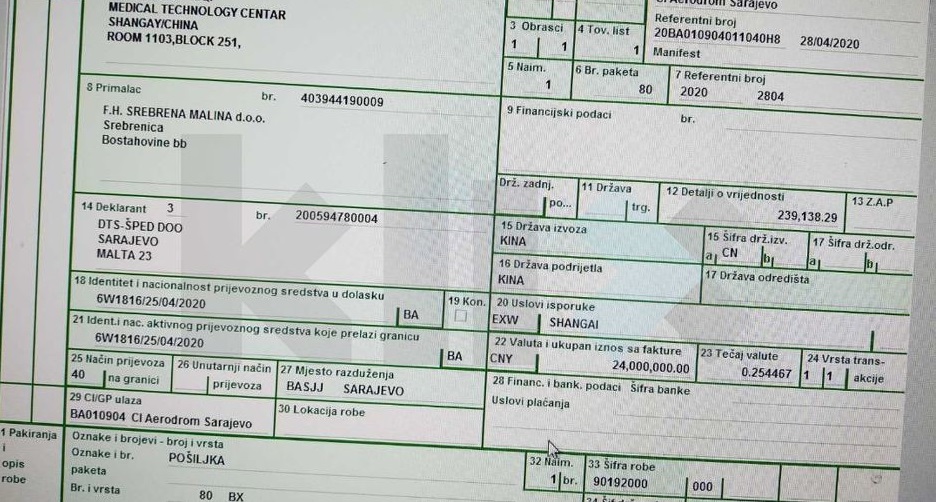 Prema zvaničnim podacima carinske deklaracije koje naš portal ekskluzivno objavljuje, za 80 respiratora, odnosno za pošiljku koju je u subotu na Aerodromu Sarajevo lično dočekao i premijer FBiH Fadil Novalić, plaćeno je 6.346.346 KM. Riječ je o iznosu bez PDV-a.