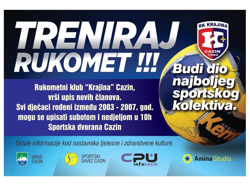 Rukometni klub „Krajina“ Cazin vrši upis novih članova u svoju rukometnu školu. Prijaviti se mogu svi dječaci rođeni između 2003. i 2007. godine. Upis se vrši subotom i nedjeljom od 10h u Sportskoj dvorani Cazin.