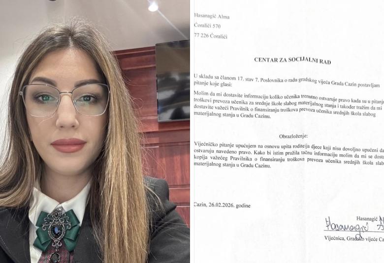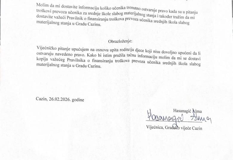 Kako je navela u objavi, od Centra je zatražila precizne podatke o tome koliko učenika trenutno ostvaruje pravo na subvencionirani prijevoz, kao i dostavljanje važećeg Pravilnika kojim je regulisano finansiranje troškova prijevoza učenika slabog materijalnog stanja na području Grada Cazina.