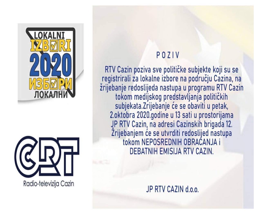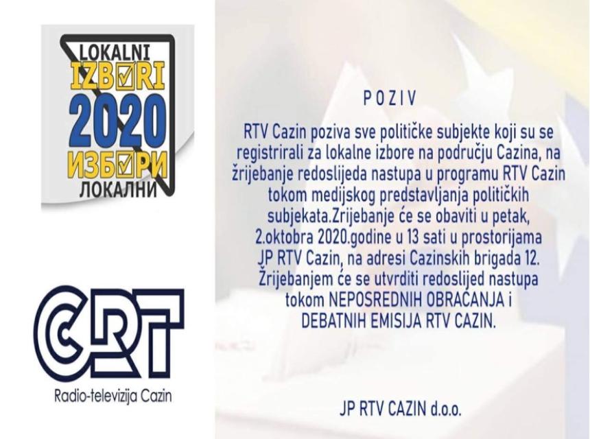 RTV Cazin poziva sve političke subjekte koji su se registrirali za lokalne izbore na području Cazina, na žrijebanje redoslijeda nastupa u programu RTV Cazin tokom medijskog predstavljanja političkih subjekata.