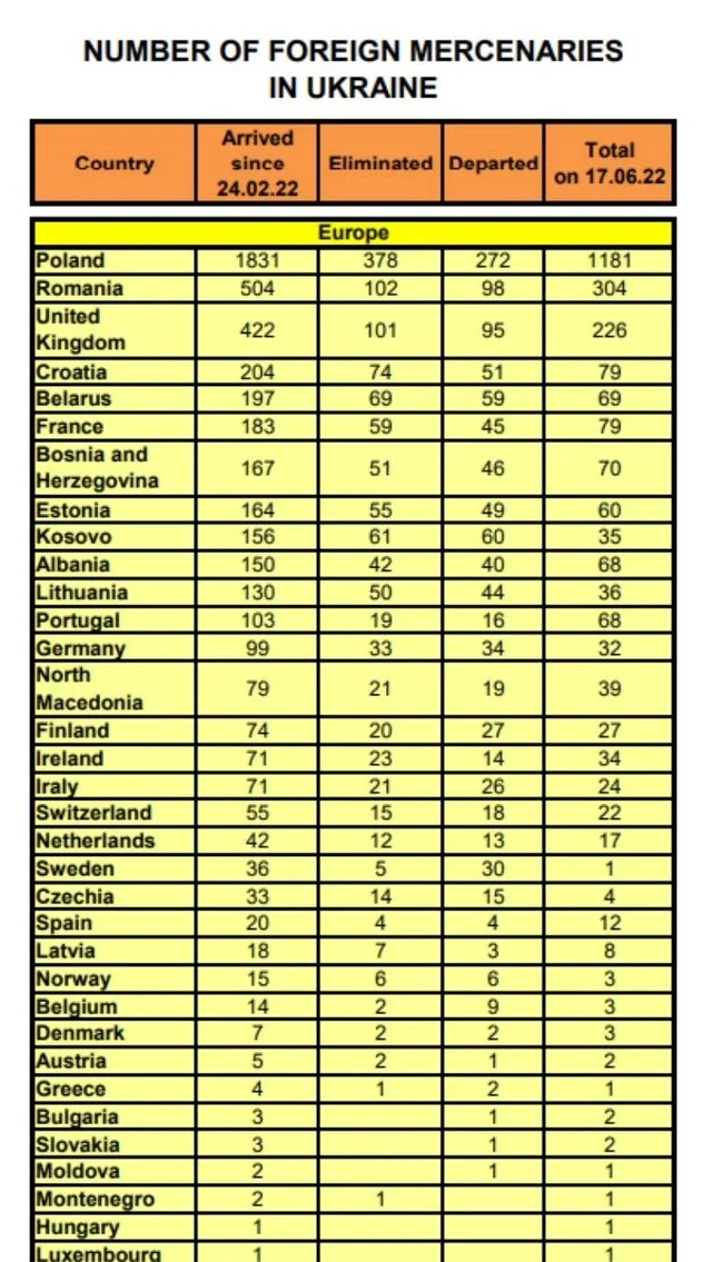 Naime, Ministarstvo odbrane Ruske Federacije objavilo je tablicu koja, kako tvrde, sadrži broj "plaćenika" koji su se došli boriti u Ukrajinu protiv ruske invazije, broj ubijenih, broj onih koji su napustili Ukrajinu te broj preostalih.