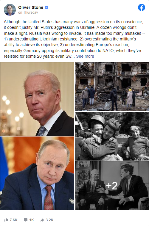 Kada je počeo rusko-ukrajinski rat, nagrađivani američki redatelj Oliver Stone objavio je kako se protiv Vladimira Putina vodi medijski rat, prozvavši zapadne medije za “histeriju”. U međuvremenu je na svom Facebook profilu objavio tekst u kojem nabraja devet ključnih Putinovih grešaka u ratu u Ukrajini. Uz opasku kako i SAD na savjesti ima mnogo ratova, Stone je rekao kako Rusija ipak nije trebala napasti Ukrajinu.