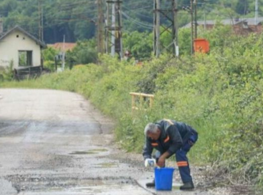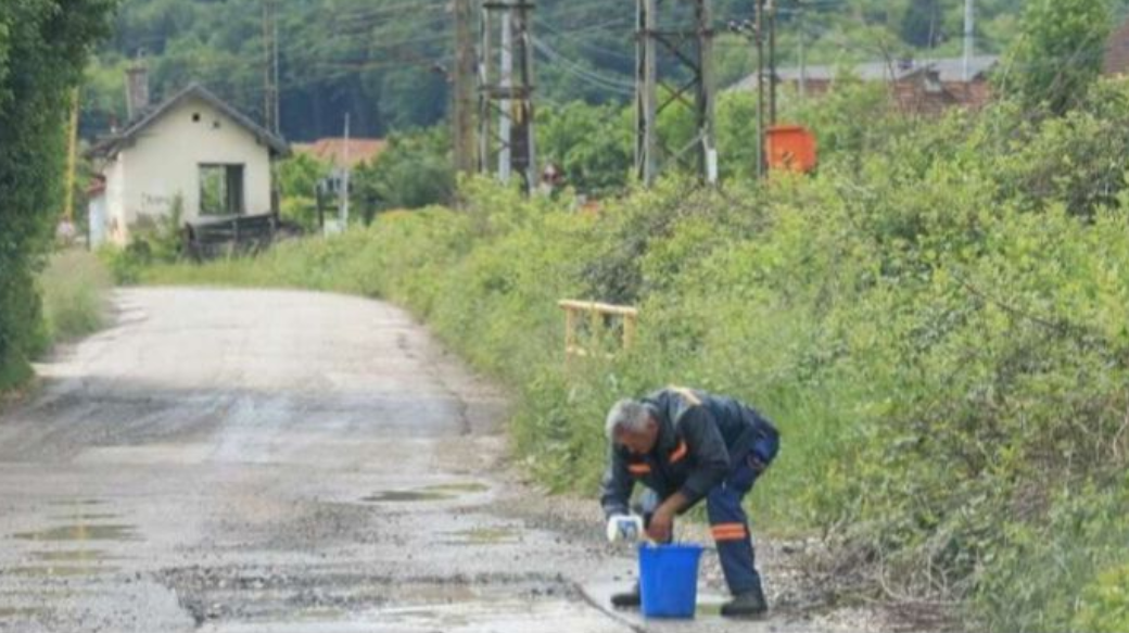 U jednom banjalučkom naselju, nesvakidašnja scena gdje se vidi da improvizacija dominira u pokušajima održavanja lokalne infrastrukture, radnik je sa kanticom od pavlake pokušavao spasiti put od propadanja.