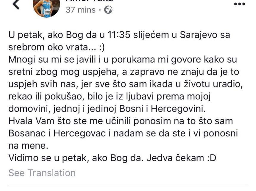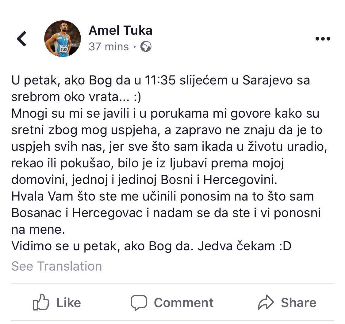 Amel Tuka, srebreni sa Svjetskog prvenstva iz Katara, objavio je na svom fb profilu da u petak sleće u Sarajevo i raduje se susretu sa svojim Bosancima i Hercegovcima. Pogeldajte objavu i poželimo dobrodošlicu šampionu.