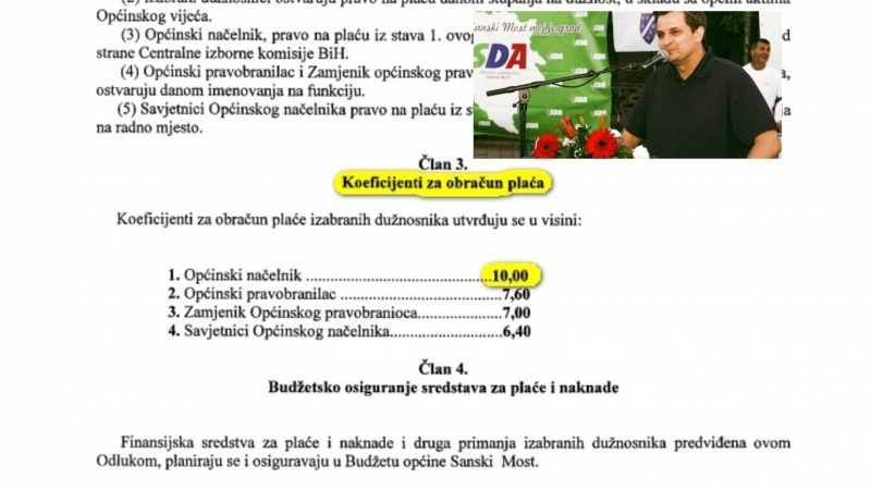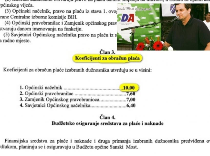 Odlukom o plaćama i naknadama koje je usvojilo Općinsko vijeće Sanski Most, načelnik Općine ima isti koeficijent za obračun plate 10 kao i premijer Federacije BiH.