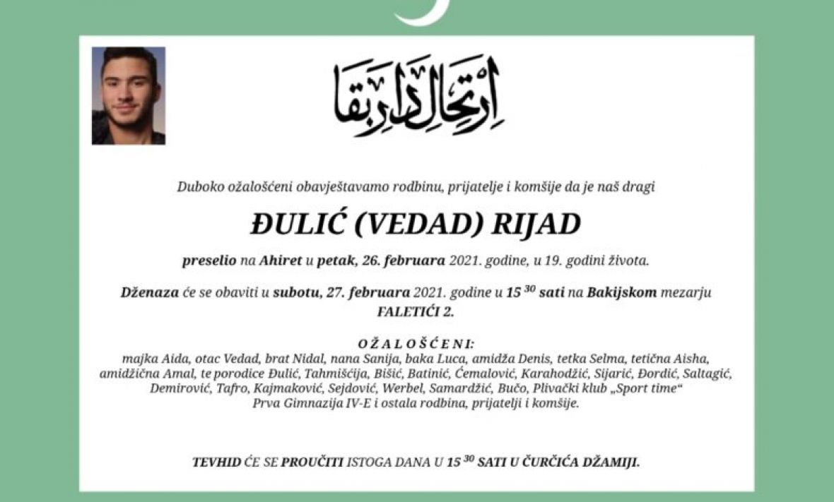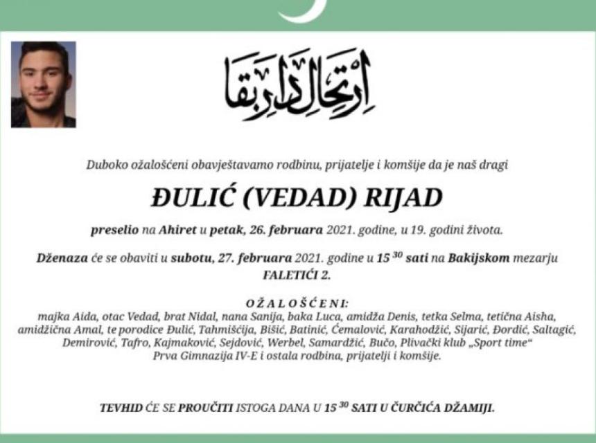 Maturant iz sarajevske Prve gimnazije Rijad Đulić preminuo je u 19. godini.