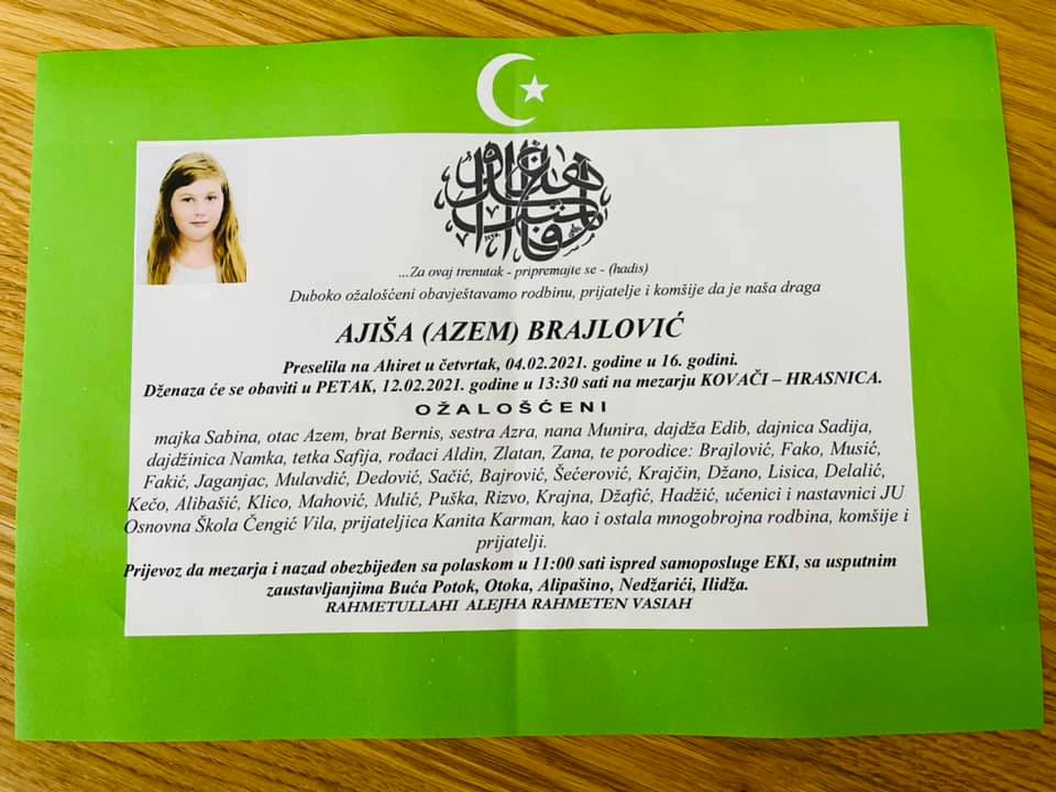 Odgovorila mi je da kada dođe kući da će vidjet kako bude. Oko 19:15 me zove plače i kaže Ajiša nije nikako dobro. Možeš li da je vozimo u Hitnu. Ja se spremim, pođemo ja i moja trudna žena u 8. mjesec. Dolazimo u Buća Potok po njih dvije. One stoje na cesti, ulaze u auto. Sjedaju mala iza mene a majka iza moje žene. Dolazimo do dna Buća Potoka, do ulice Drinska. Ajiša samo gubi svijest. Moja žena dodaje vodu, majka vrišti, pokušava joj dat vještačko disanje. Počinje da se gubi skorz i na raskrsnici kod FDS prestaje davati znakove života. Vozio sam kao da sutra ne postoji. Prolazio kroz crveno, vozio po trotoaru. Stigli smo za 2 min u Hitnu pomoć i samo su viknuli “Reanimacija!”
