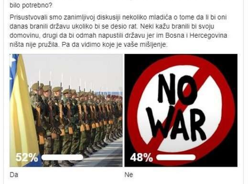 Naime, nije tačno da “mladi muškarci u Sarajevu” ne bi branili vlastitu domovinu, niti to da ih je “većina glasala za ‘NE’, tačnije 55 posto”, jer, kako se može vidjeti, “anketa” je završena tako da je ipak 52% onih koji bi branili domovinu.