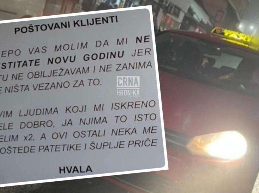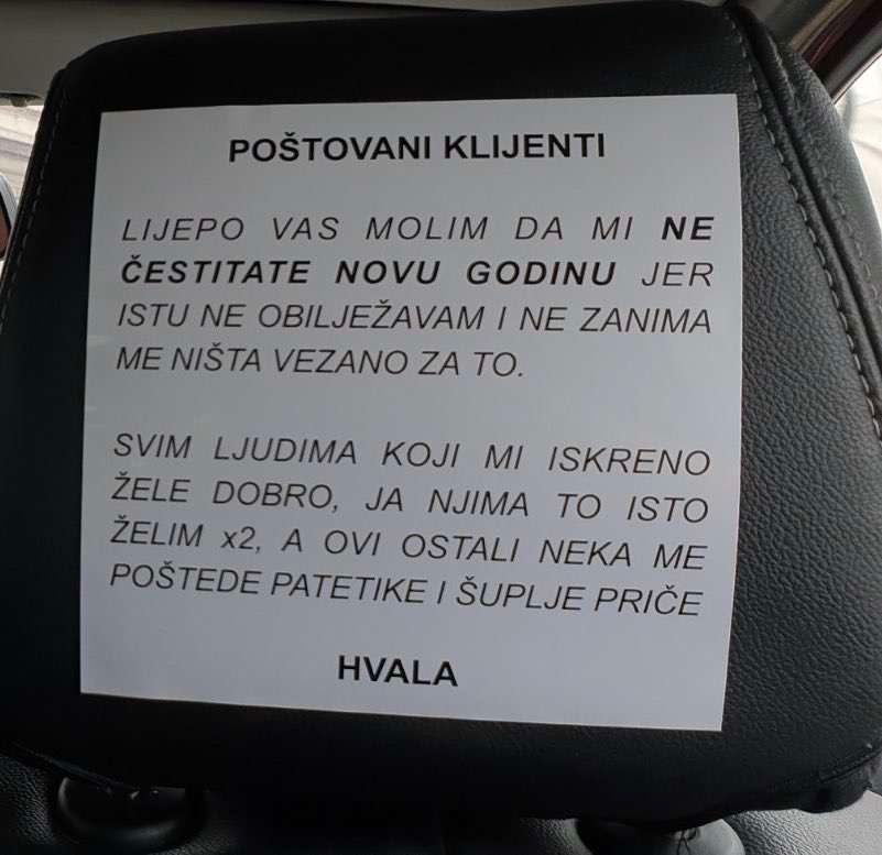 Jedan od njih je i sarajevski taksista kojem je očito dosadilo da mu mušterije koje prevozi čestitaju Novu godinu, pa je zato za njih u automobilu ostavio zanimljivu poruku.