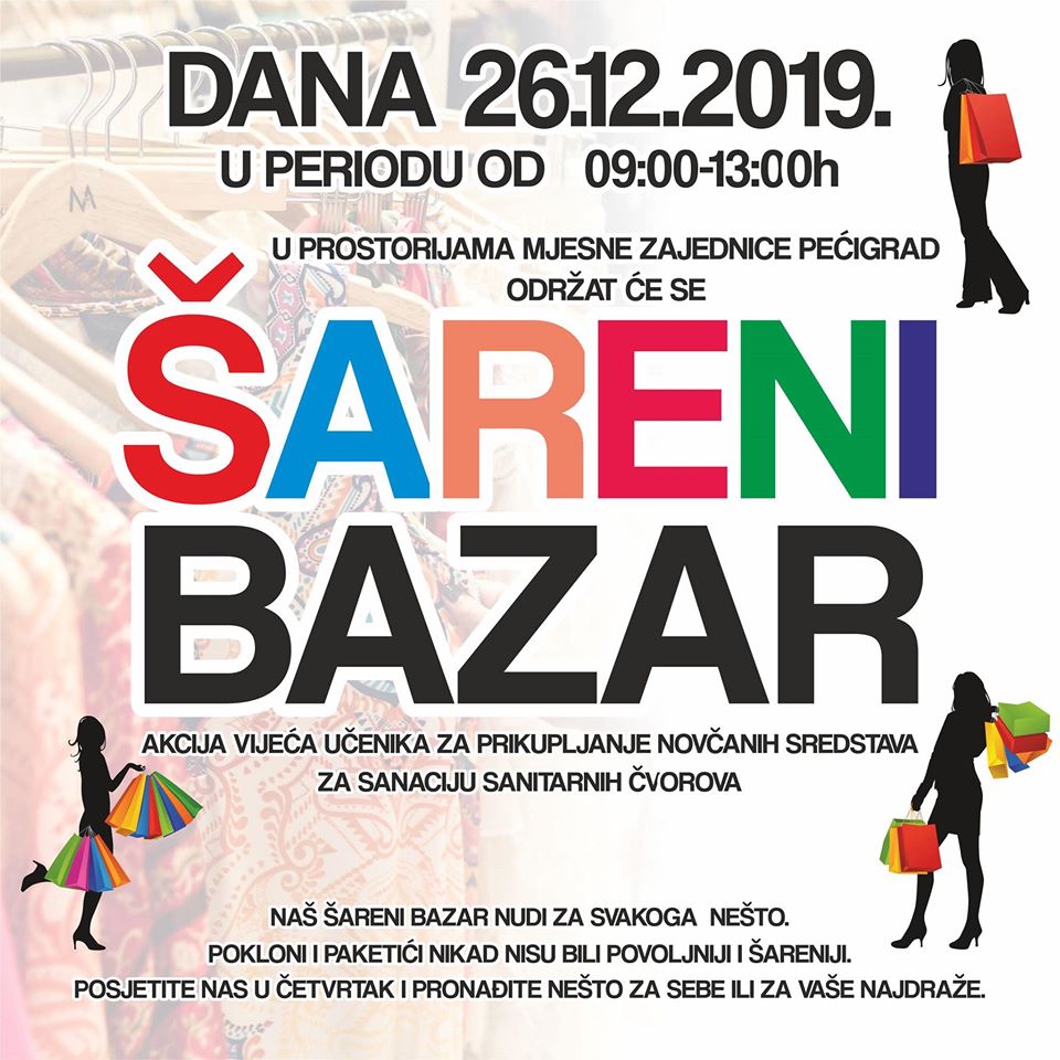 Šareni bazar je akcija Vijeća učenika PŠ Pećigrad, a na njemu ćete moći kupiti novogodišnje paketiće za djecu, igračke, nakit, odjeću i slično.