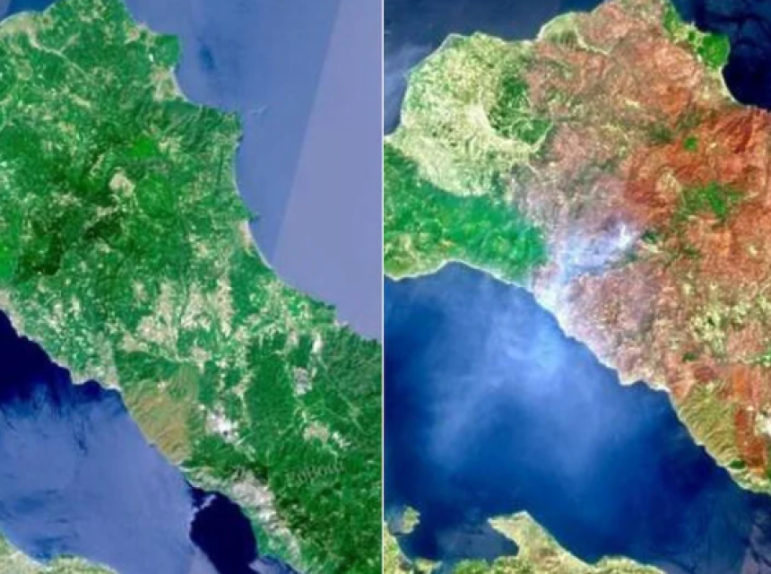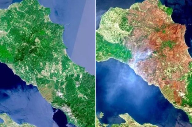 Satelitski snimci su nastali u periodu između 1. i 11. augusta te jasno pokazuju štetu uzrokovanu požarima na grčkom otoku Eviji. Procjenuje se da je izgorjelo 50.910 hektara vegetacije uprkos velikim naporima vatrogasaca. Nakon sedam dana je vatrena stihija tek djelomično stavljena pod kontrolu, a dobra vijest je da kiša pomaže vatrogascima u njihovom radu. Ipak, nekoliko gromova je uzrokovalo nove požare.