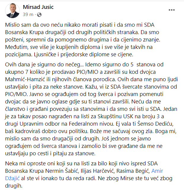“Neću da me članstvo i građani povezuju sa stanovima i da smo svi isti u SDA. Jedan je za takav posao nagrađen na listi za Skupštinu USK na broju 3, a drugi Upravnim odbor na federalnom nivou. Ej, vala ti Šemso Dediću, baš kadroviraš dobro ovu politiku. Bože me sačuvaj ovog zla. Boga mi, mislio sam da smo drugačiji od drugih. Još jednom se javno ograđujem od šverca stanova i zamolio bi sve građane da me ne ustavljaju po cesti i pitaju za stanove.