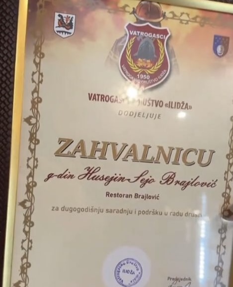 Poznati sarajevski ugostitelj Husein Sejo Brajlović dobio je posebnu zahvalnicu za dugogodišnju saradnju i podršku u radu Vatrogasnog društva Ilidža.