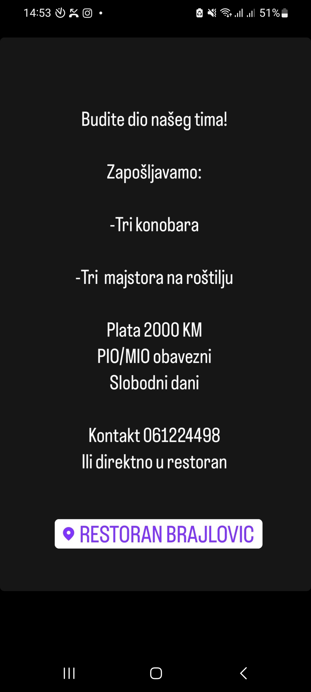 Na službenom Instagram profilu restorana Brajlović objavljen je oglas s osnovnim informacijama.