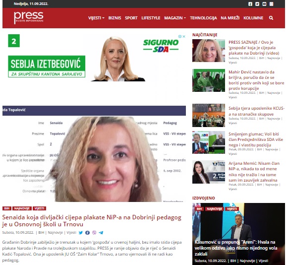 Ono što je najdramatičnije u cijeloj priči jeste činjenica da je Senaida Kadić-Topalović zapravo članica NiP-a, stranačka kolegica Elvedina Okerića čiji je plakat jučer "stradao" na Dobrinji, ali i Aljoše Čampare čiji je, već dugo se priča, portal i identificirao ženu s klipa koji se vrlo brzo proširio internetskim prostorom u našoj državi.