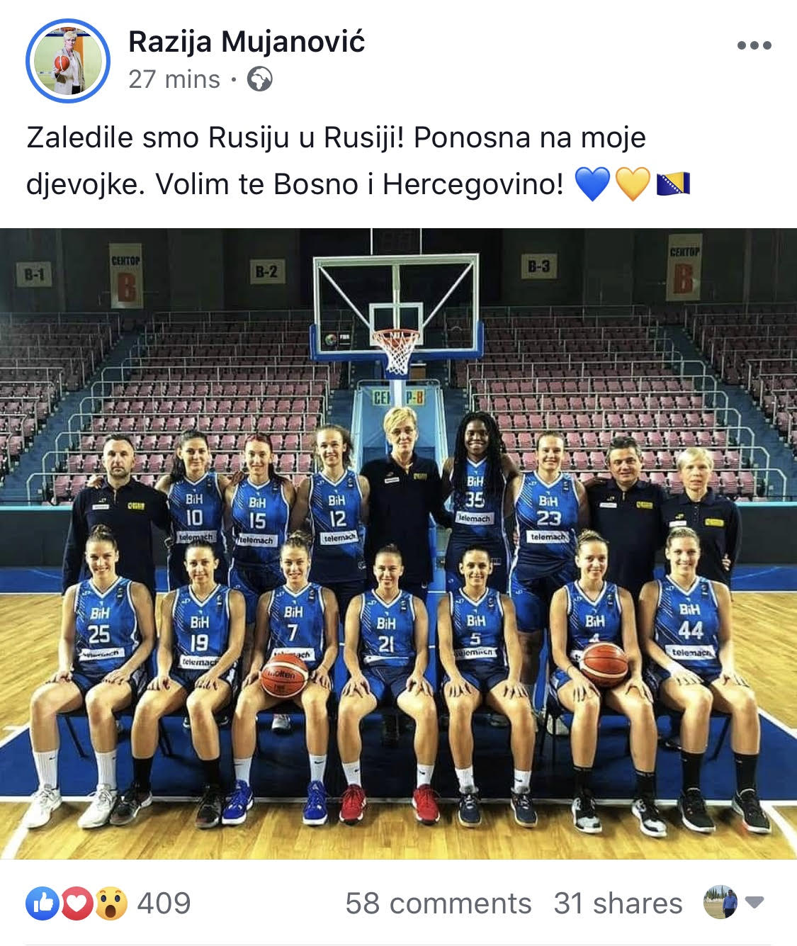 Senzacija u Rusiji. Naše košarkašice otvorile kvalifikacije pobjedom protiv favoriziranih domaćina, reprezentacije Rusije, rezultatom 69:70. Slavna Razija Mujanović, koja se nalazi sa svojim djevojkama, ovako je prokometarisala pobjedu: Zaledile smo Rusiju u Rusiji :) Bravo Razija i hvala za sve što činiš za našu BiH. Sretno i nadalje.