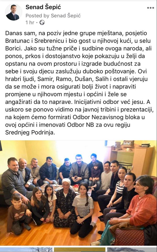 Predsjednik Nezavisnog bloka Senad Šepić boravio je danas u Bratuncu i Srebrenici i formirao Nezavisni odbor za općinu Bratunac. Kako je najavio na svojoj Fb stranici, u Podrinju je boravio, na poziv jedne grupe mještana koje ne posjetio u njihovom selu, Borici u Bratuncu. Nezavisni blok je politička stranka koja se jako brzo širi u zadnje vrijeme širom BiH.