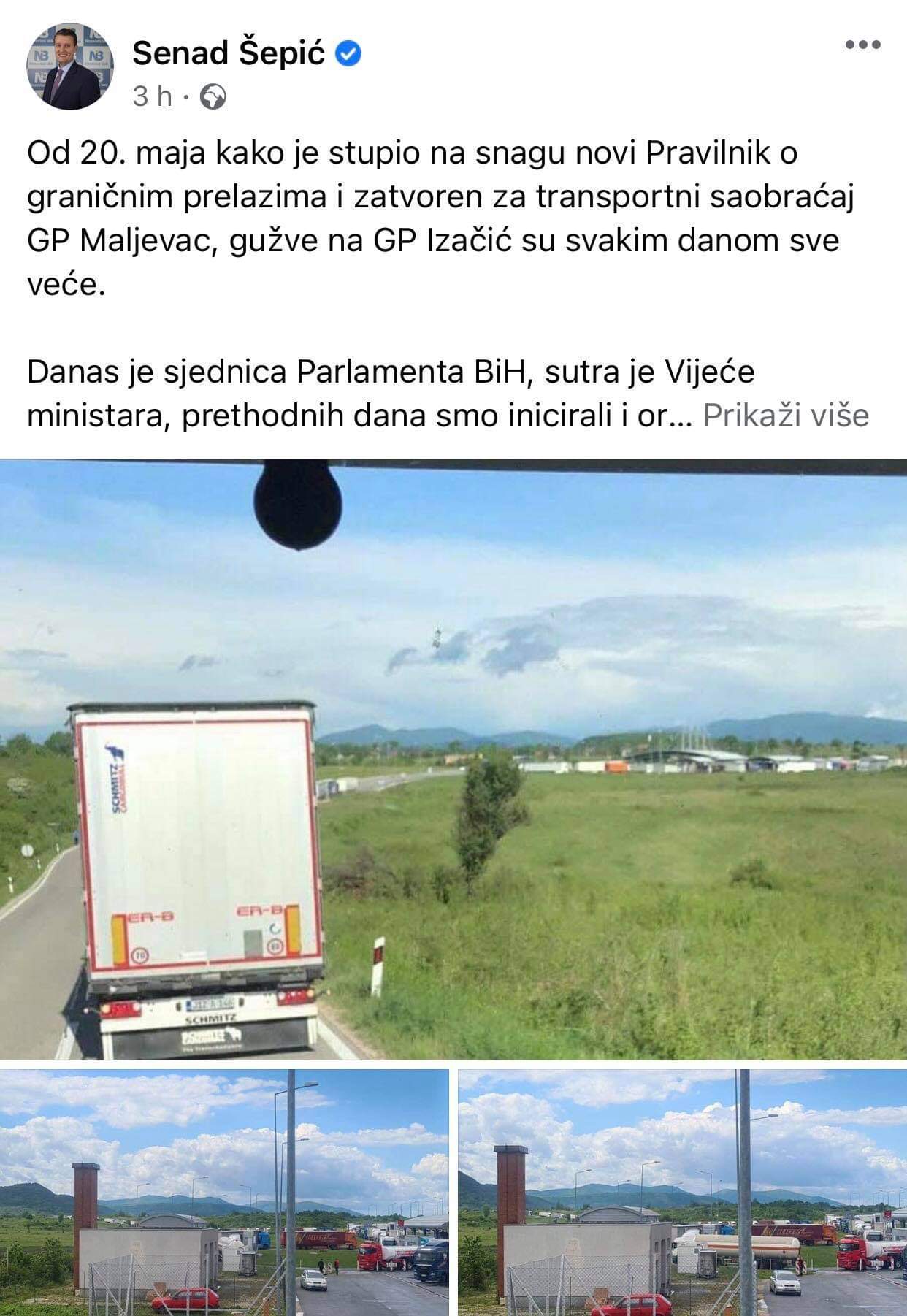 Odluka Republike Hrvatske da za transportni saobraćaj zatvori GP Maljevac uzrokovala je u nekoliko fana velike probleme privredi i prevoznicima u USK. Danas se u sve, po inicijativi Nezavisnog bloka uključio i Parlament Bosne i Hercegovine, a predsjednik ove stranke Senad Šepić je proteklih dana alarmirao sve najviše državne zvaničnike na akciju. Na svome FB danas je dodatno poručio: