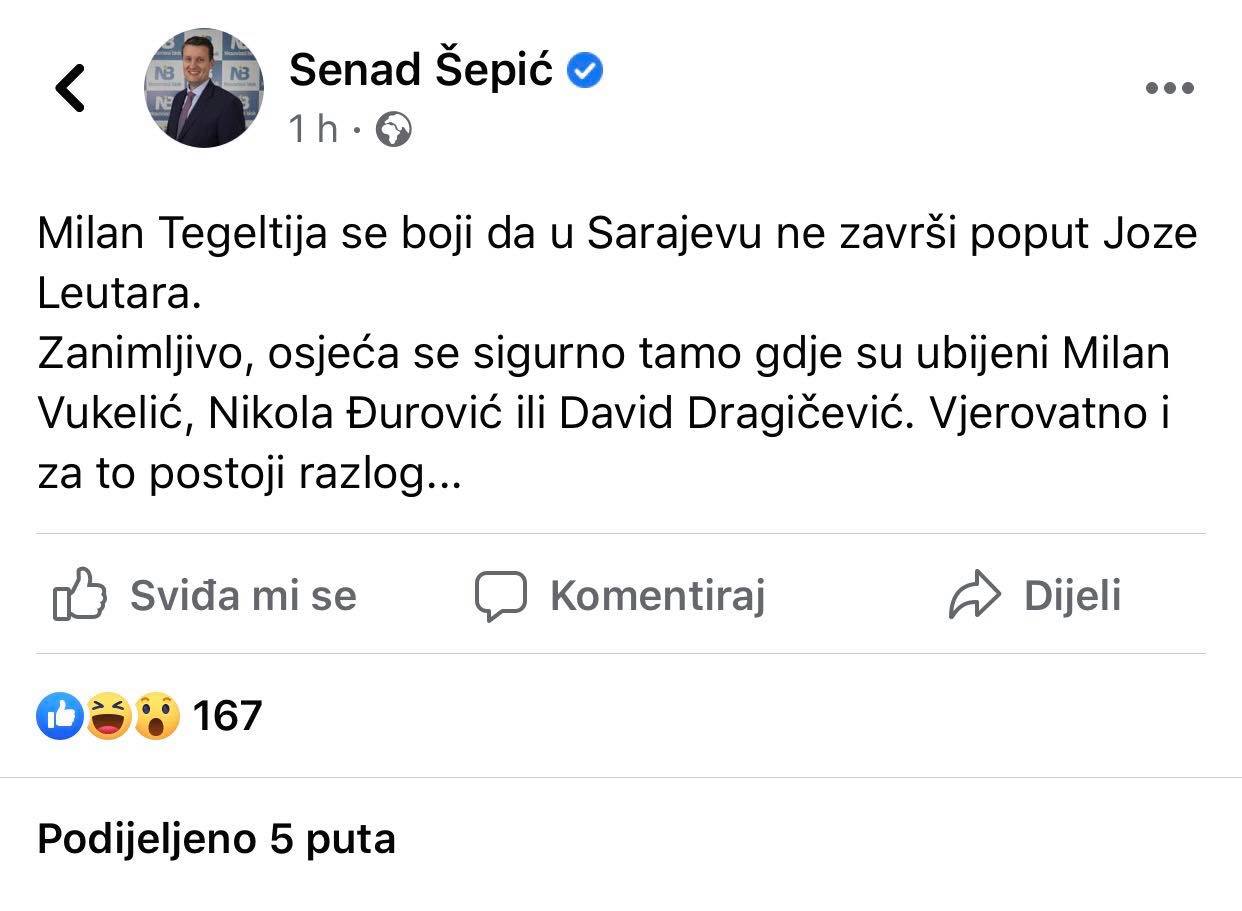 Tegeltija se nevješto brani u zadnje vrijeme, a posljednja u nizu argumenata je da mu je ‘sigurnost ugrožena u Sarajevu’. Najefektniji komentar i odgovor na ovu tvrdnju, dao mu je predsjednik Nezavisnog bloka Senad Šepić, na svome twitter i FB nalogu: