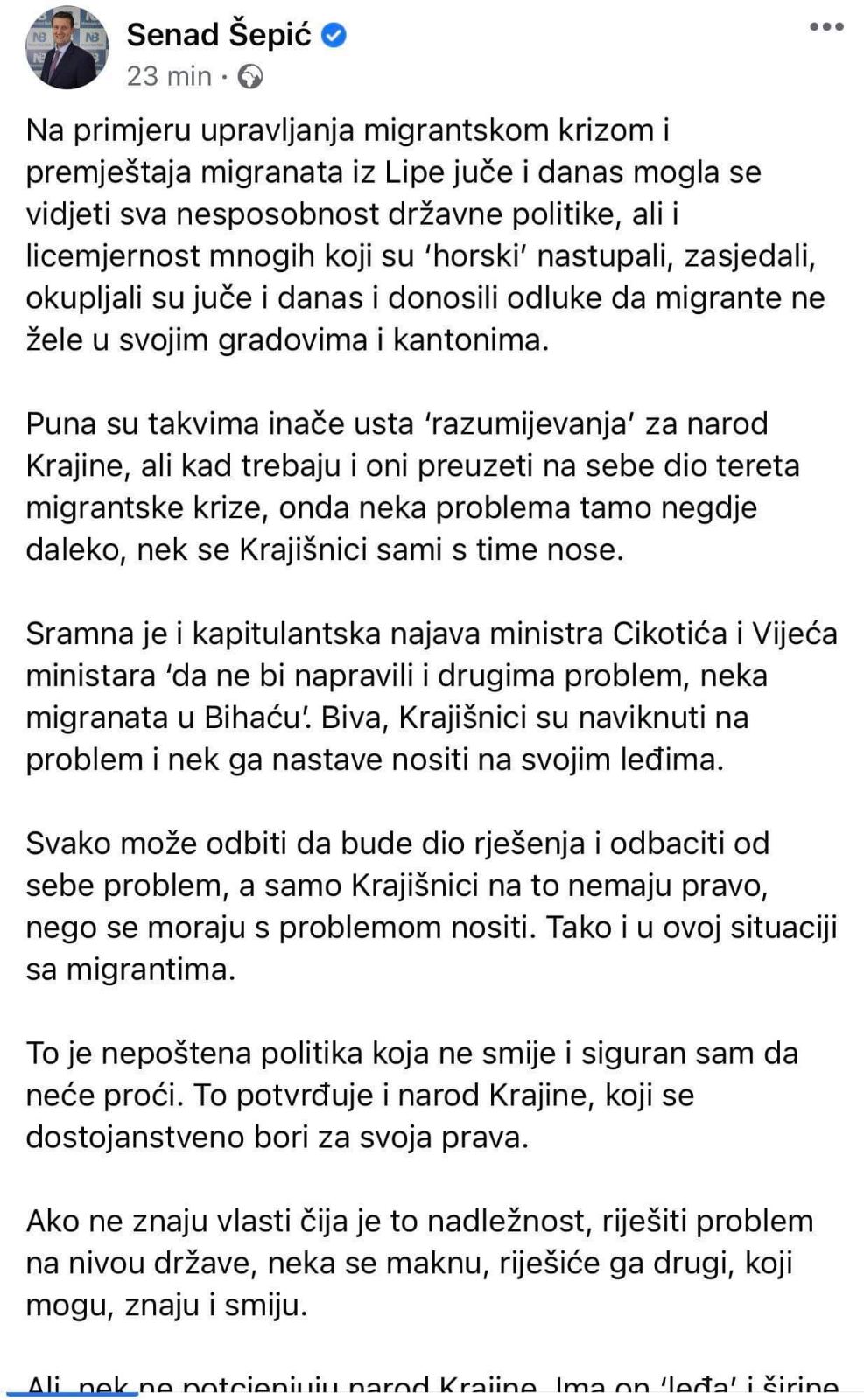“Na primjeru upravljanja migrantskom krizom i premještaja migranata iz Lipe juče i danas mogla se vidjeti sva nesposobnost državne politike, ali i licemjernost mnogih koji su ‘horski’ nastupali, zasjedali, okupljali su juče i danas i donosili odluke da migrante ne žele u svojim gradovima i kantonima.