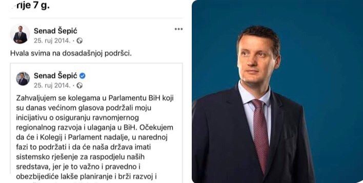 Pozivam sve koji kažu da žele vidjeti pošteniju raspodjelu naših sredstava sa viših nivoa, na svaki pedalj BiH, da se pridruže i da se zajedno izborimo za ovaj prijedlog.”- napisao je Senad Šepić uz screenshot objave koju je postavio prije 7 godina.