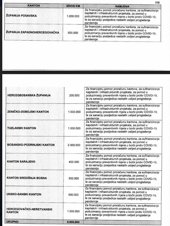 Nikome nije jasno kako je recimo općina sa 5000 stanovnika i bez ijednog zaraženog, Kupres dobila 700 hiljada KM ili Novi Travnik koji je dobio milion i 200 hiljada KM, a da recimo Cazin, koji ima 70 hiljada stanovnika i već 11 zaraženih dobije samo 50 hiljada KM. Na USK, recimo, Bužim je dobio 400 hiljada KM, dok su recimo Cazin i Bosanska Krupa zajedno dobile ukupno 100 hiljada. Je li to zato što je jedino u USK, jedan načelnik općine iz reda SDA, i to baš onaj u Bužimu?
