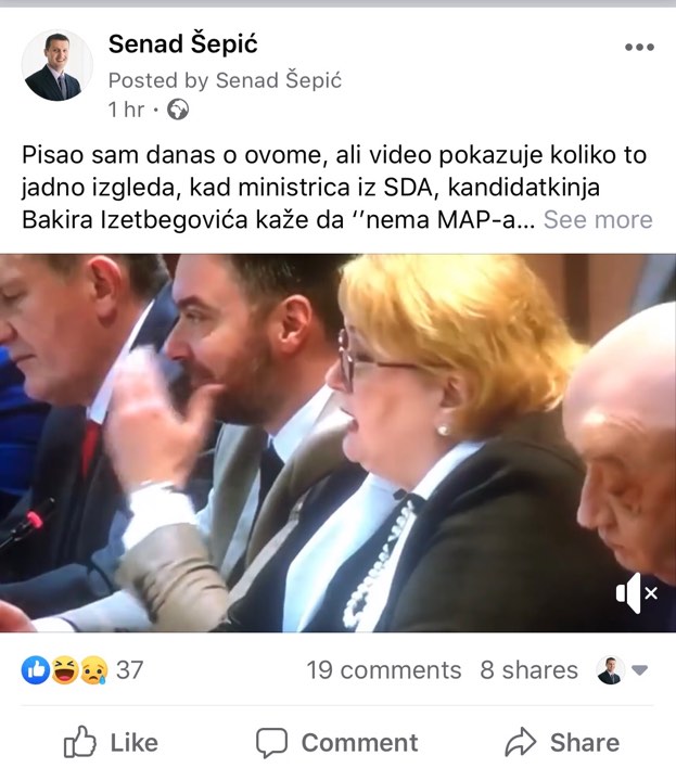 "Pisao sam danas o ovome, ali video pokazuje koliko to jadno izgleda, kad ministrica iz SDA, kandidatkinja Bakira Izetbegovića kaže da ‘’nema MAP-a, iako je on bio najavljen i da će o članstvu BiH u NATO biti referendum’’, a na to se podsmijava novi Dodikov ministar Košarac i kaže da i to što su čuli od ministrice Turković potvrđuje da je jasno da nema članstva, nego se radi o partnerstvu. Zato je tužno za ovu zemlju i narod, da ga isti lider, Bakir Izetbegović, nakon bestijalne laži u Vijećnici o tužbi BiH protiv Srbije, ponovo na isti način laže i ponižava. Vjerujem da ‘Bog neće promijeniti stanje jednog naroda, dok taj narod ne promijeni sebe’, valja nam svima o ovome razmisliti, a znam i za onu staru, ‘možeš kako hoćeš, ali nećeš dokle hoćeš’."