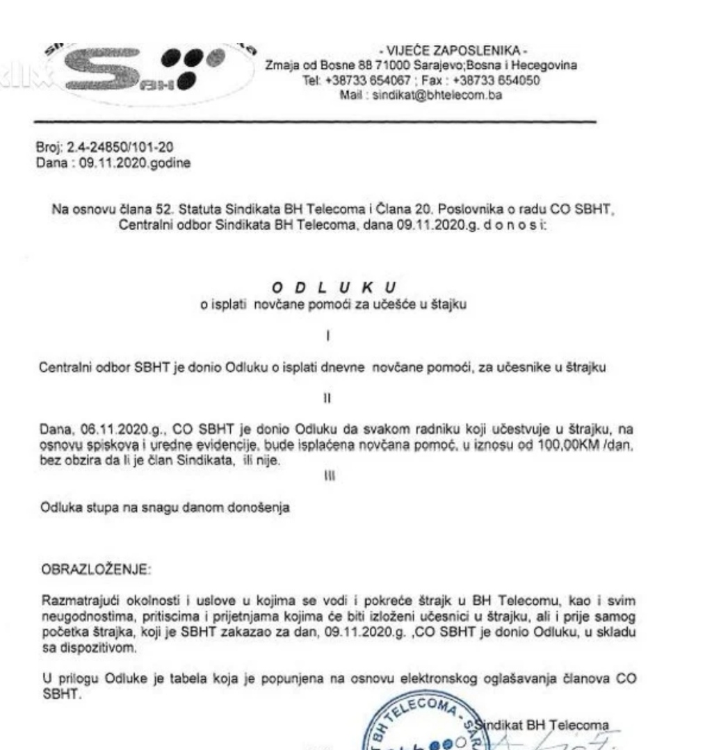 "Dana 6. novembra, Centralni odbor Sindikata BH Telecoma je donio odluku da svakom radniku koji učestvuje u štrajku, na osnovu spiskova i uredne evidencije, bude isplaćena novčana pomoć, u iznosu od 100 KM po danu", navodi se u odluci.