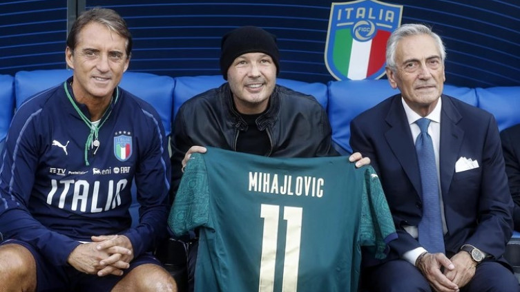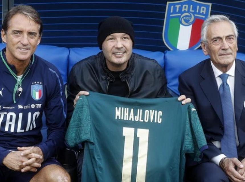 On je nenajavljen došao na trening Italijana i iznenadio dugogodišnjeg prijatelja koji je trenutno selektor "Azura". Mančini je poklonio dres Italije Mihajloviću sa brojem 11 i natpisom "Mihajlović".